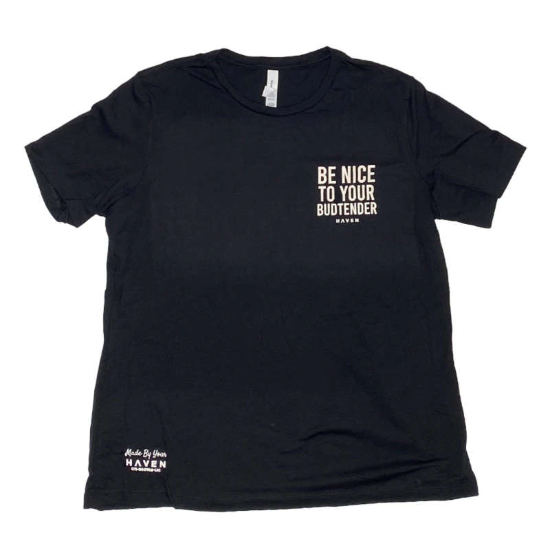 A classic black women's tee with a Haven exclusive Be Nice to Your Budtender design.