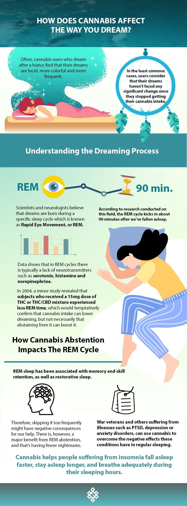 There is little doubt that the images we see flashing in front of our eyes as we sleep is the result of a deep neural activity that kicks off the minute we've fallen asleep. However, data still hasn't revealed in full certainty what causes it. It has been partially attributed to memory retention, since in our dreams our daily recollections may flash in any random number of ways. Emotional processing is undoubtedly linked to the dreaming process as well. A lesser number of researchers believe dreams have no meaning at all. Nonetheless, considering that we spend almost 20% of sleeping hours in this cycle, these questions will have to be answered at some point, as well as what are the possible impacts cannabis and its correlated substances have on this process. Users and cannabis enthusiasts who have taken upon themselves to find out the effects cannabis has in the dream cycle, have often reported it intensifies dreaming, especially after taking a break from use.