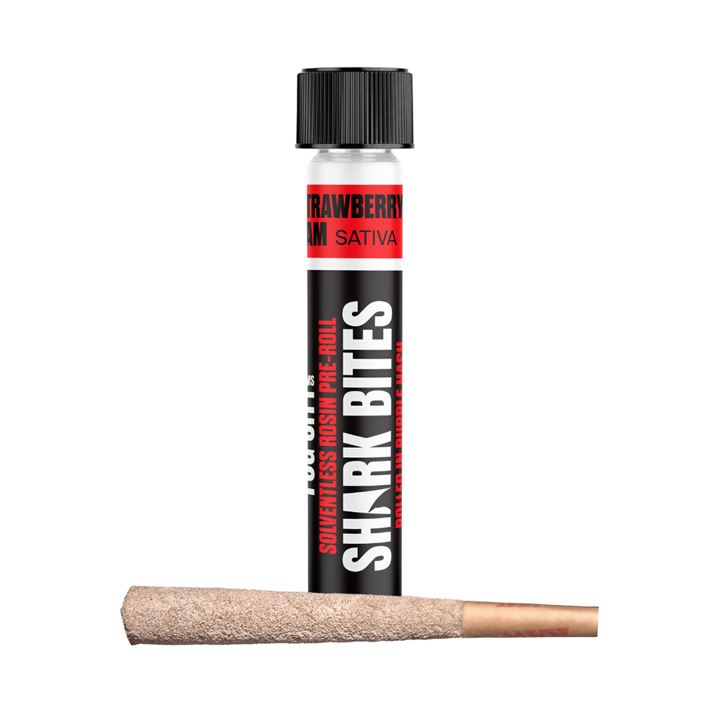 Shark Bites infused prerolls are packed with single strain, whole flower, infused with solventless rosin, and rolled in bubble hash. Because they are made without the use of any chemicals, they are an exceptionally clean and smooth product, aligning with Fog City Farm’s unwaveringly high standards. Carefully curated every step of the way for quality and potency, Shark Bites are truly in a league of their own. Go ahead and get chomped. // Strain: This sativa leaning hybrid has a tantalizing aroma of jammy strawberry, honey, and earth. It translates to taste beautifully with a flavorful exhale. This delicious strain provides a euphoric, gentle energy that can open up the creative senses. A smooth balance of both mind and body effects make it a top choice for most consumers, with various levels of experience.