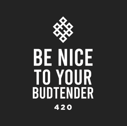 A classic black shirt with a Haven exclusive Be Nice to Your Budtender design.